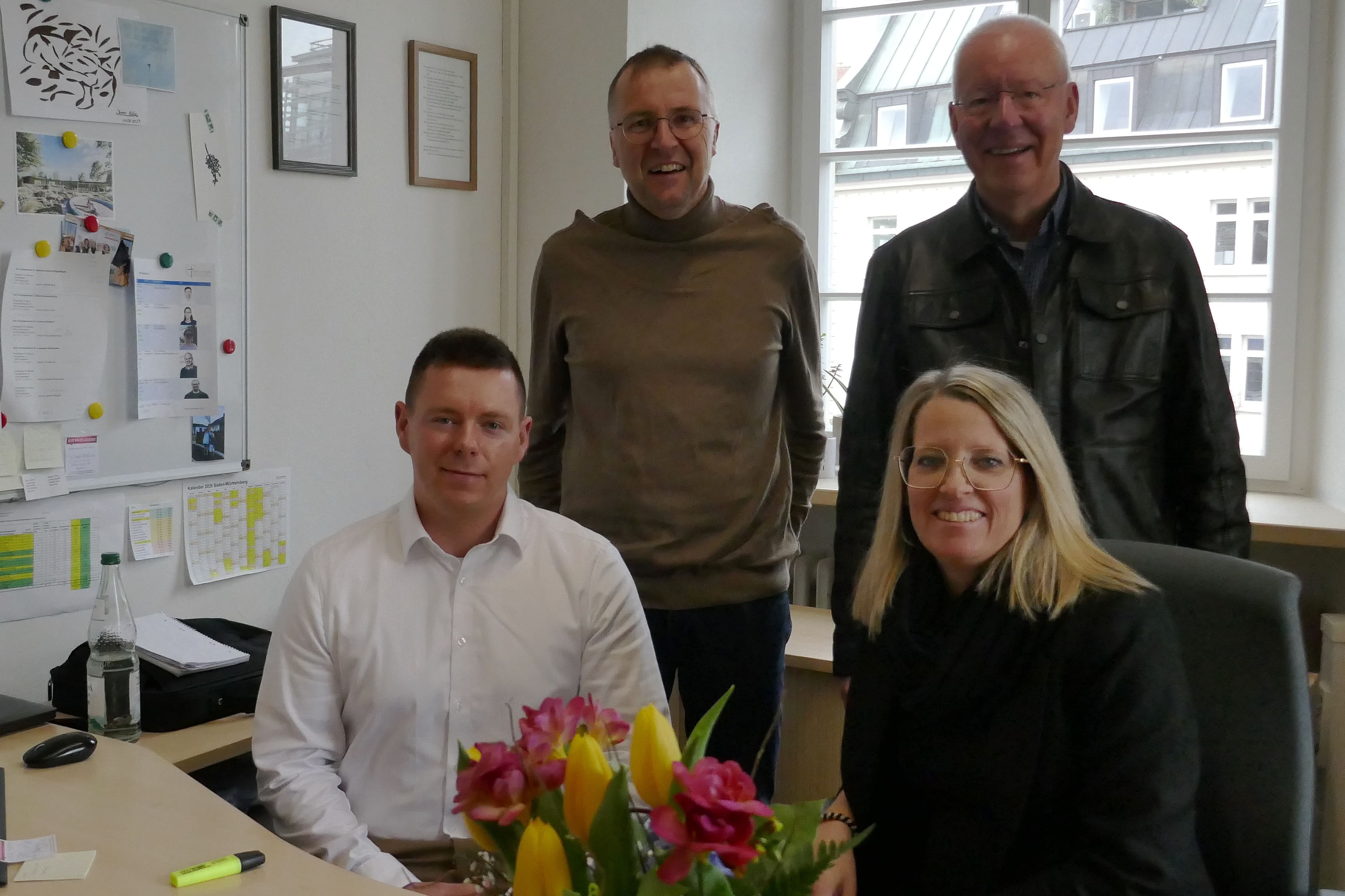 Auf dem Bild sind zu sehen hinten von links nach rechts: Klaus Knödler, Leiter des KVZ, Dekan Robert Kloker, Vorsitzender des Gesamtkirchengemeinderats GD, vorne links Herr Weiß und rechts Frau Kälin.
